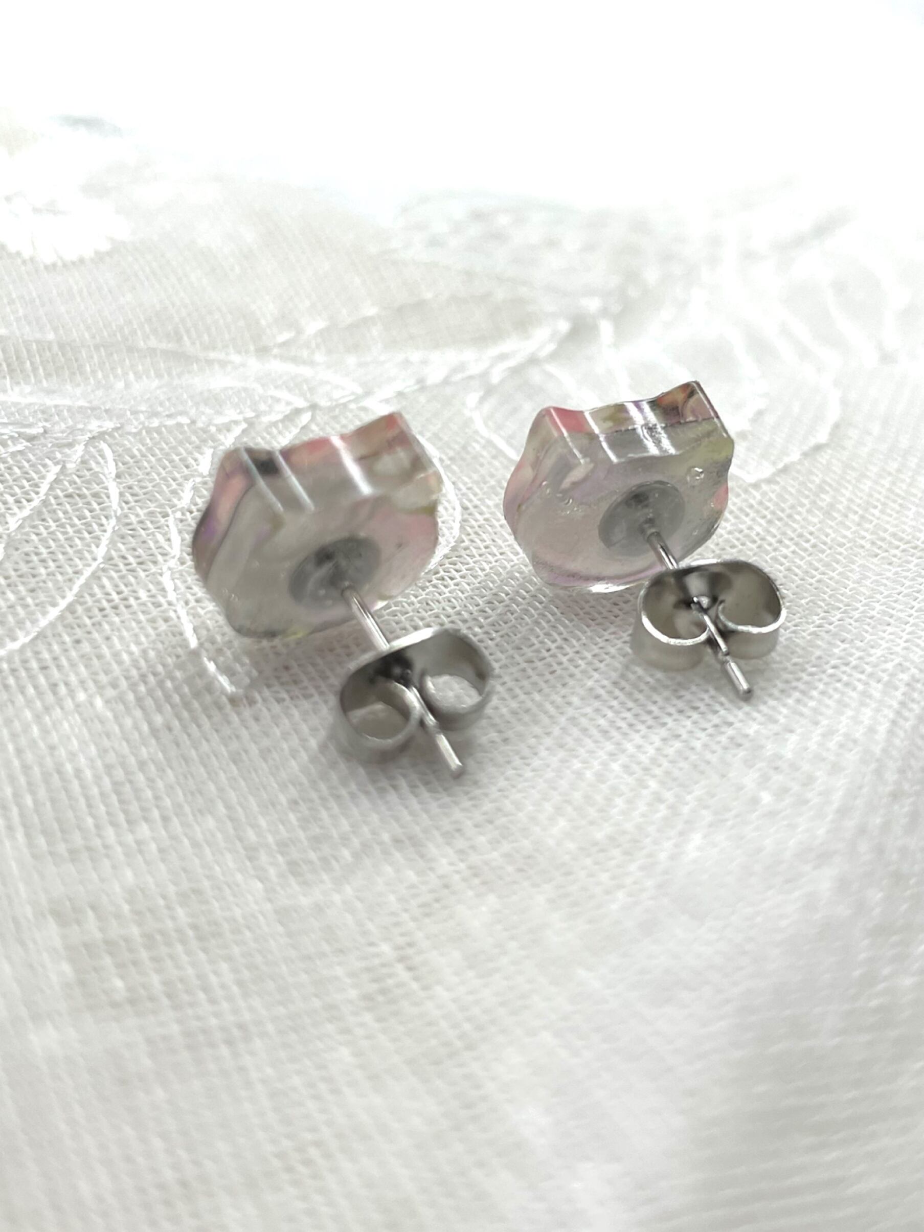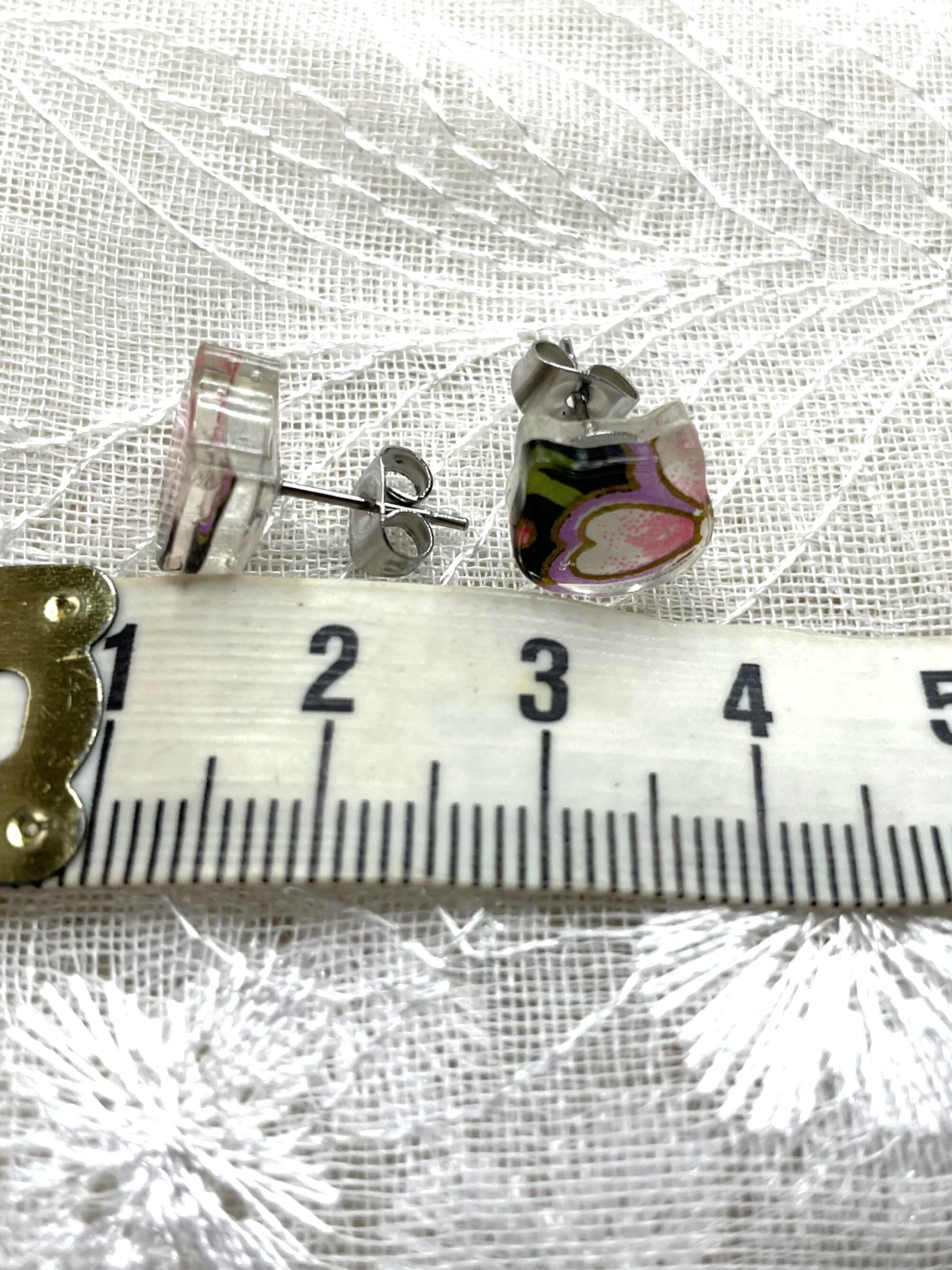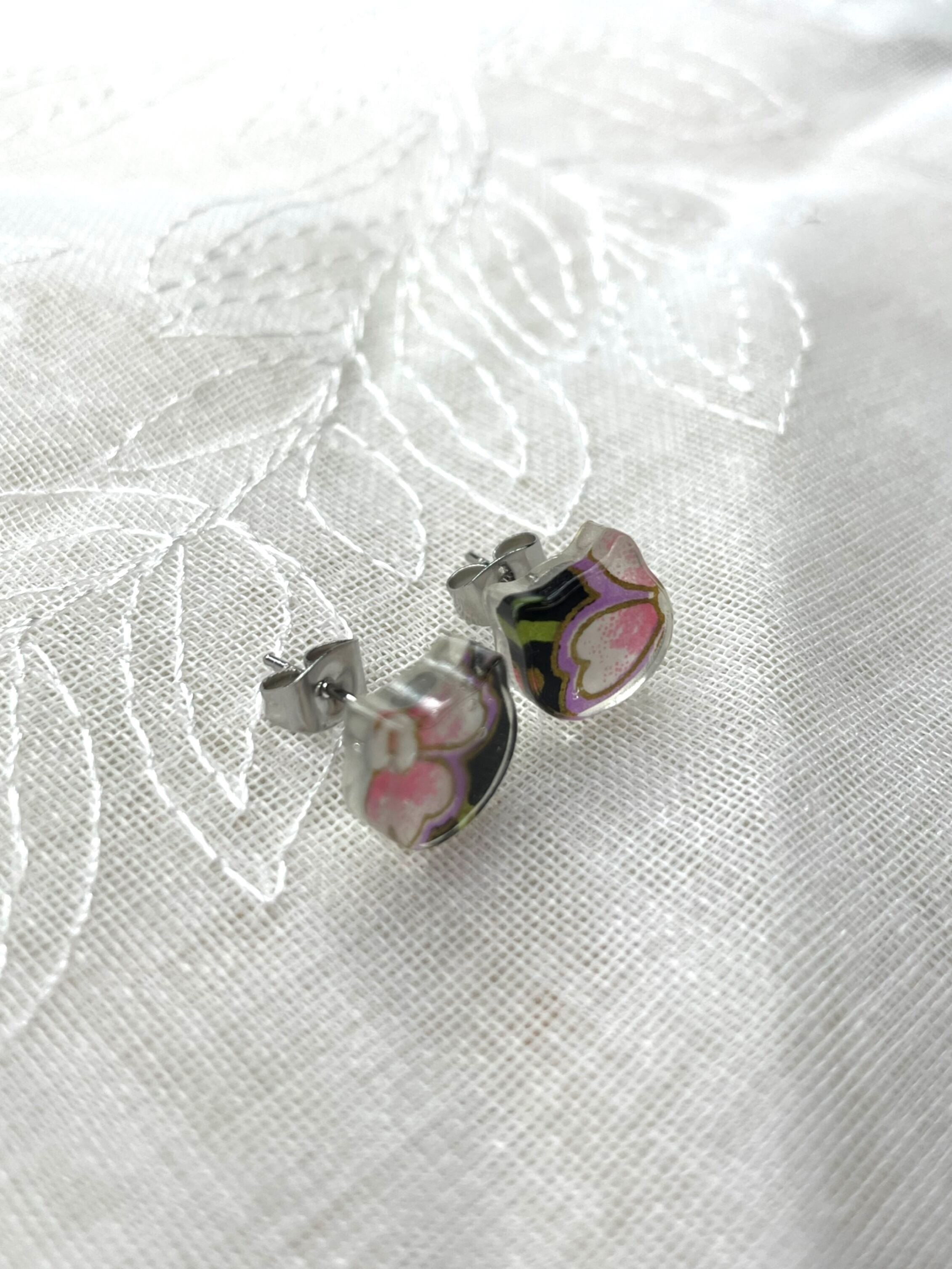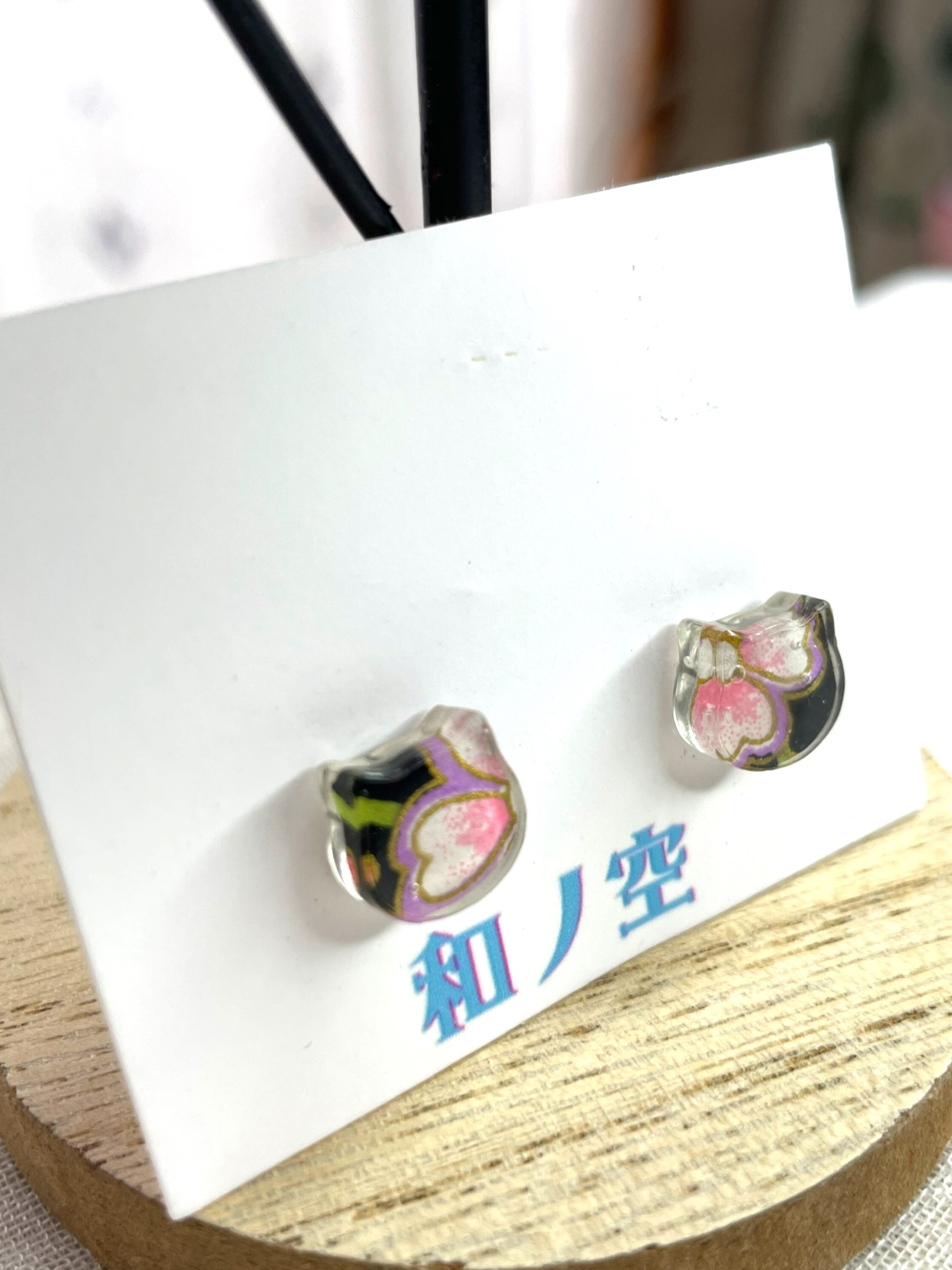 このピアスは本物の和紙をカットし、レジンの中に入れたデザインです。ピアスの接着面は、接着剤とレジンを使用し、しっかりと固定されています。強い衝撃には注意が必要ですが、和の美しさを引き立てるアクセサリーとしての利用を特におすすめします。また、和服にも洋服にも気軽に取り入れられ、あなたの独自のスタイルを楽しむことができます。小さいサイズだからこそ、コーディネートにも取り入れやすさがあります。