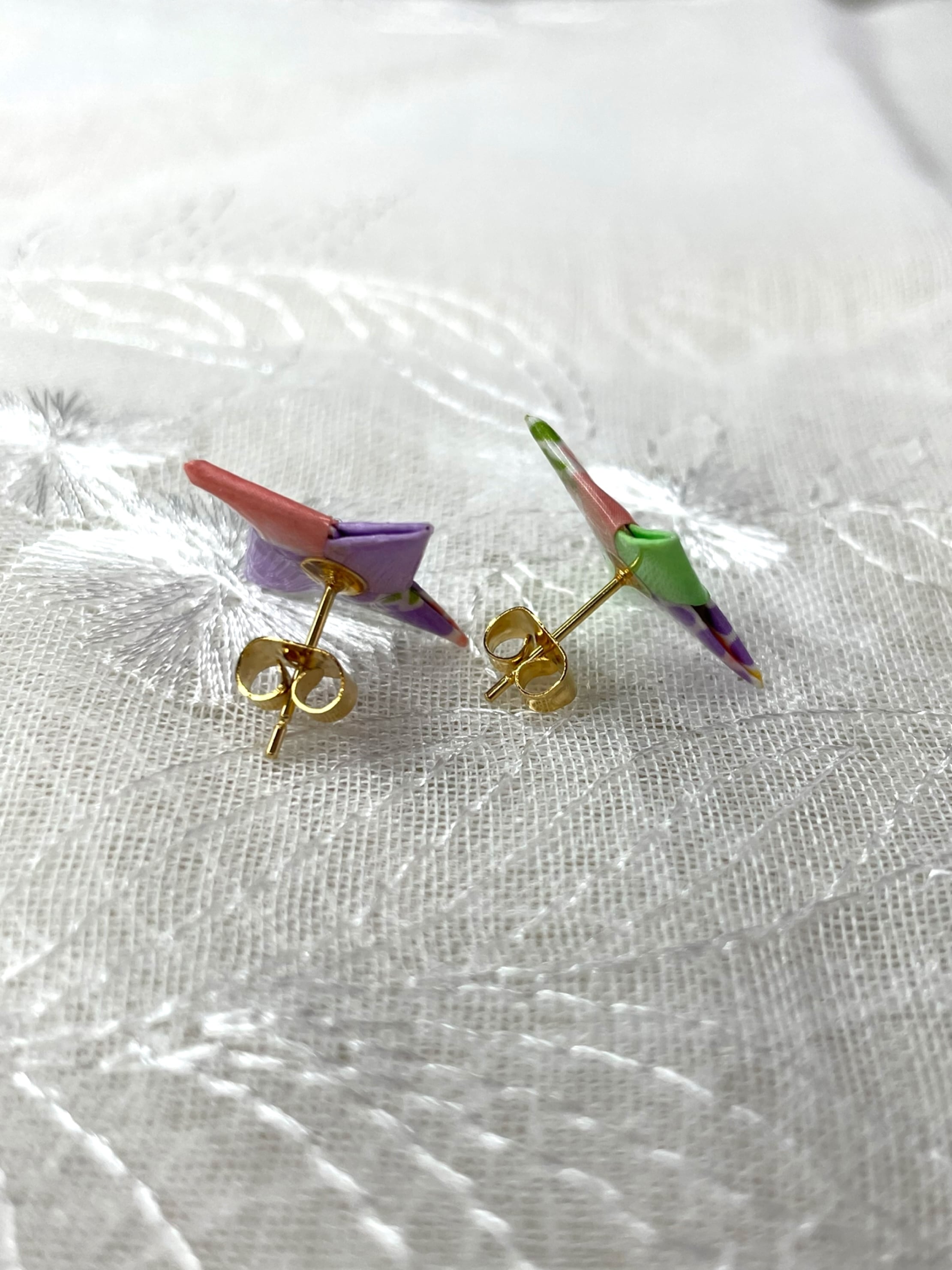 このピアスは本物の折り紙を追って、ツヤ出しのニスでコーティングしています。裏面の接着面には接着剤とレジンを使用してるため、頑丈に制作してます。強い衝撃には注意が必要ですが、和の美しさを引き立てるアクセサリーとして特におすすめです。和服にも洋服にも気軽に取り入れられ、あなたの独自のスタイルを楽しむことが可能です。コンパクトなサイズだからこそ、コーディネートにも取り入れやすさがあります。