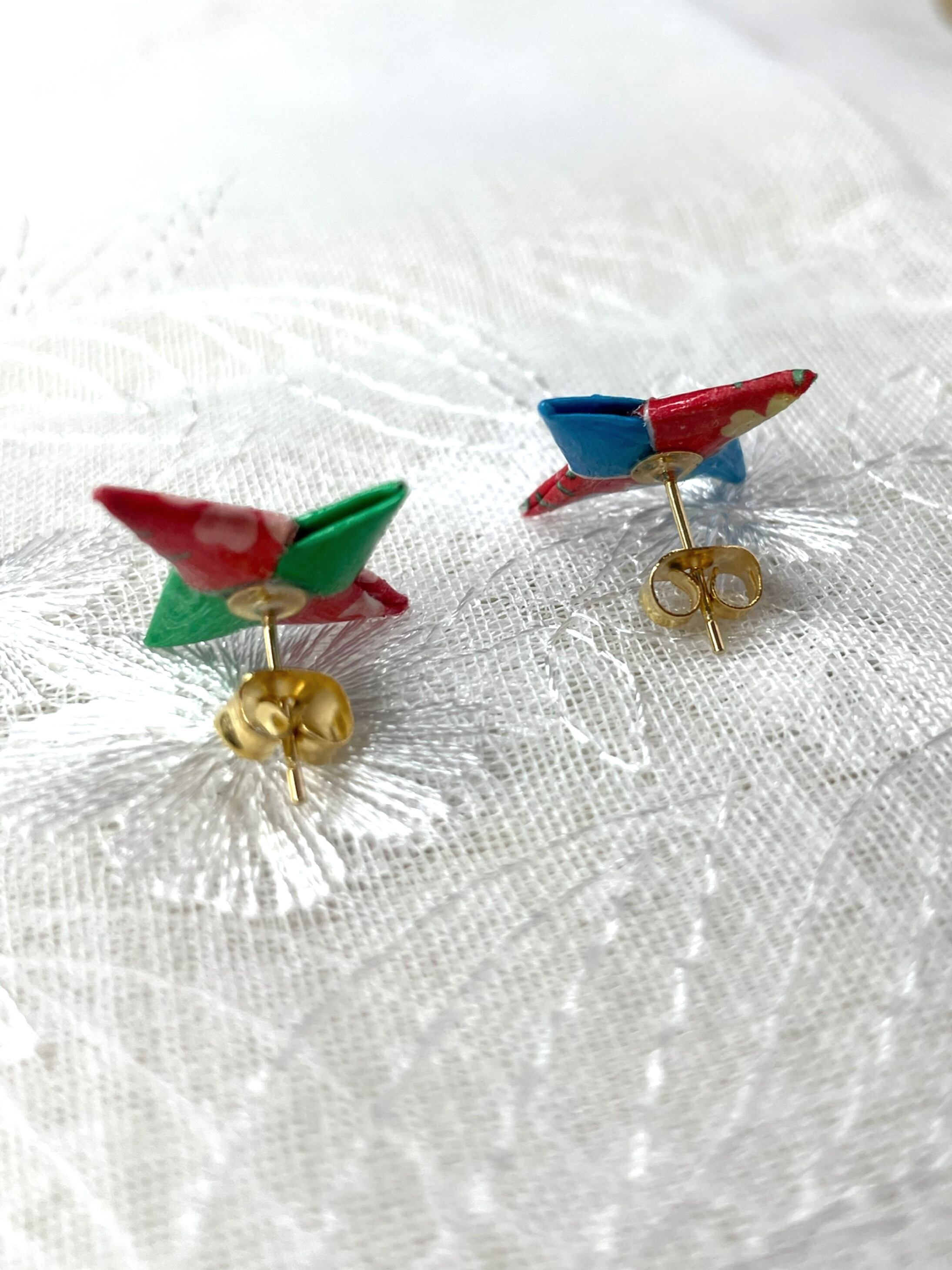 このピアスは本物の折り紙を使用し、その上からツヤ出しのニスでコーティングしています。裏面の接着面には接着剤とレジンを使用しているため、頑丈に制作しています。強い衝撃には注意が必要ですが、和の美しさを引き立てるアクセサリーとして特におすすめです。和服にも洋服にも気軽に取り入れられ、あなたの独自のスタイルを楽しむことが可能です。コンパクトなサイズだからこそ、コーディネートに取り入れやすいです。